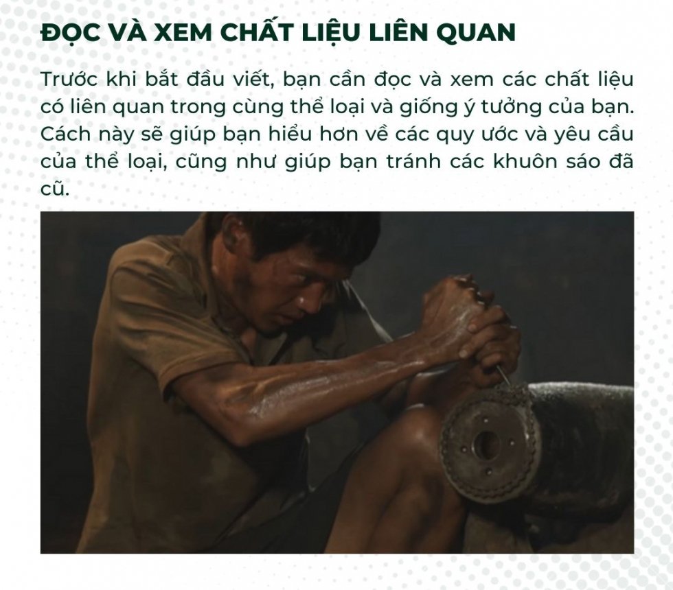Trước khi bắt đầu viết, bạn cần đọc và xem các chất liệu có liên quan trong cùng thể loại và giống ý tưởng của bạn. Cách này sẽ giúp bạn hiểu hơn về các quy ước và yêu cầu của thể loại, cũng như giúp bạn tránh các khuôn sáo đã cũ.